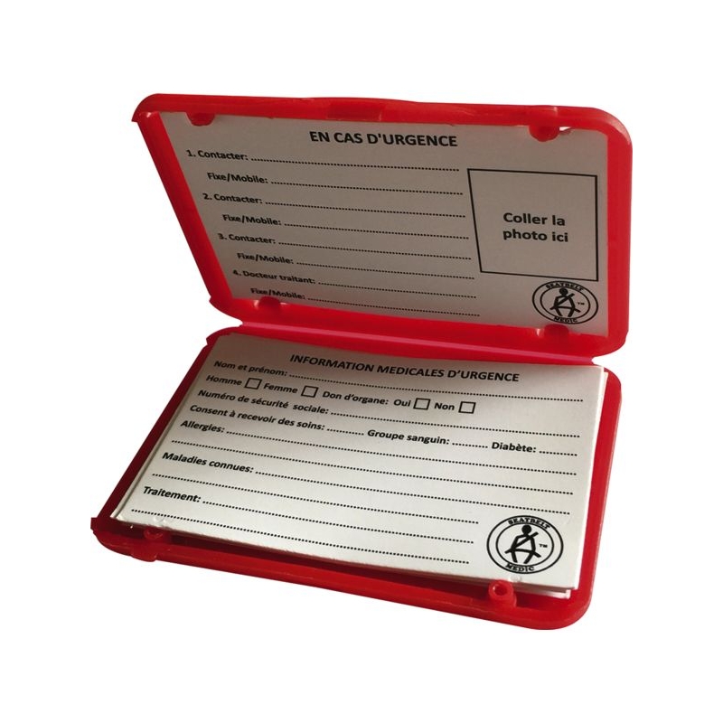 Facile à clipser à la ceinture ou au harnais, ce boîtier plastique contient les informations médicales et la photo du porteur. Composé de : - 1 boîtier, - 2 lots de cartes d’information à compléter manuellement, - 1 autocollant de parebrise.