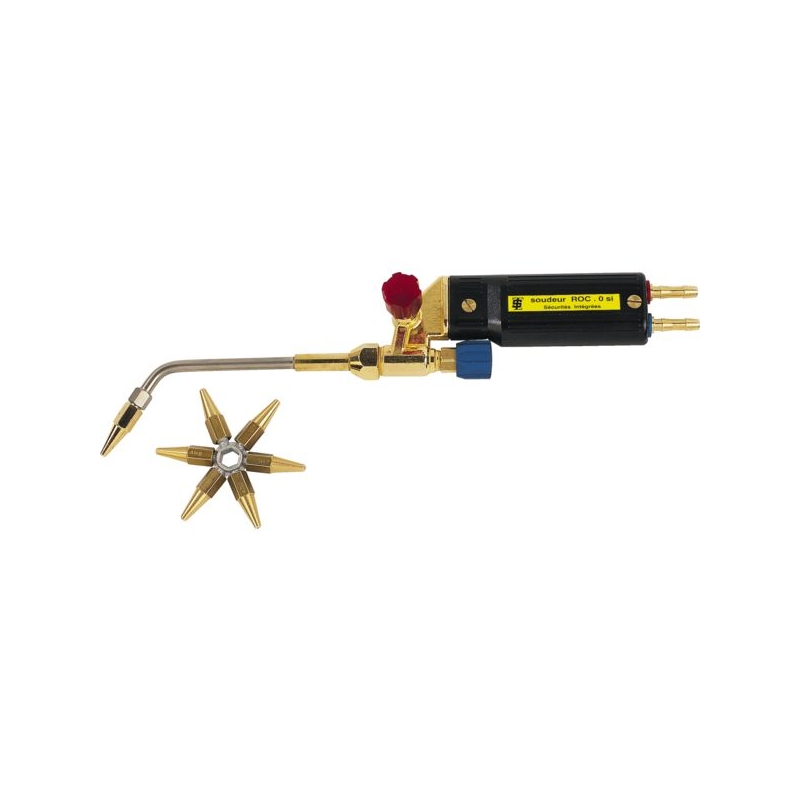 Corps en laiton matricé. Pour les travaux de soudage, brasage et soudo-brasage. Épaisseur maxi de soudage 4 mm. Lance démontable avec clé. Débit : 100 à 400 l/h Douille entrée : 6,2 x 12 mm Livré avec 7 buses.