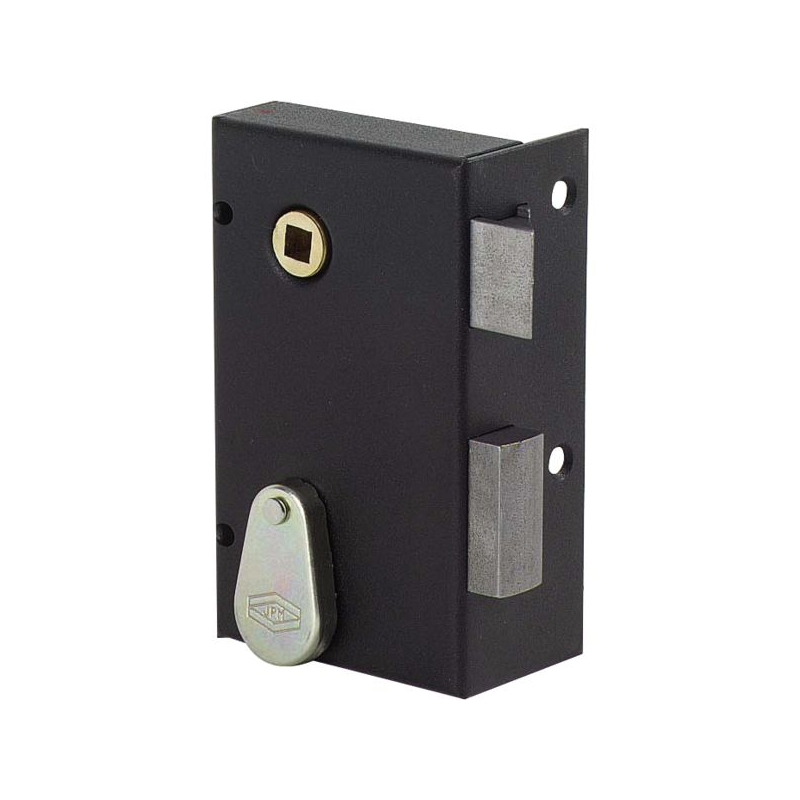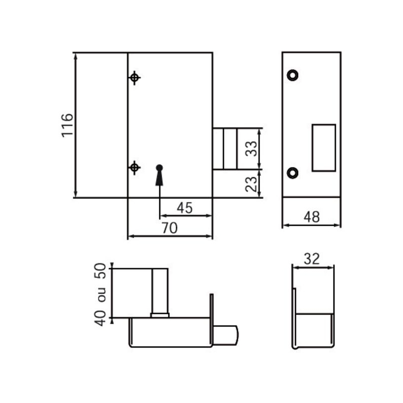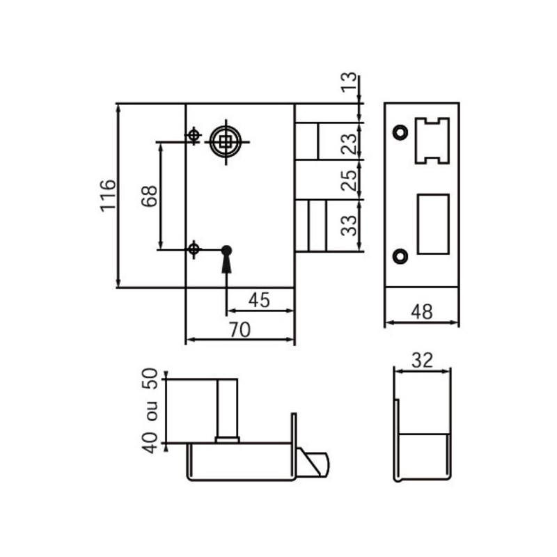 Vertical, à fouillot, pour tout type de porte. Pêne ½ tour en acier zingué. Livré avec gâche et 2 clés. Coffre : 116 x 70 x 25 mm Canon : 40 mm Axe : 44 mm Entraxe : 68 mm Fouillot carré : 7 mm Course du pêne dormant : 16 mm Finition : époxy noir grainé