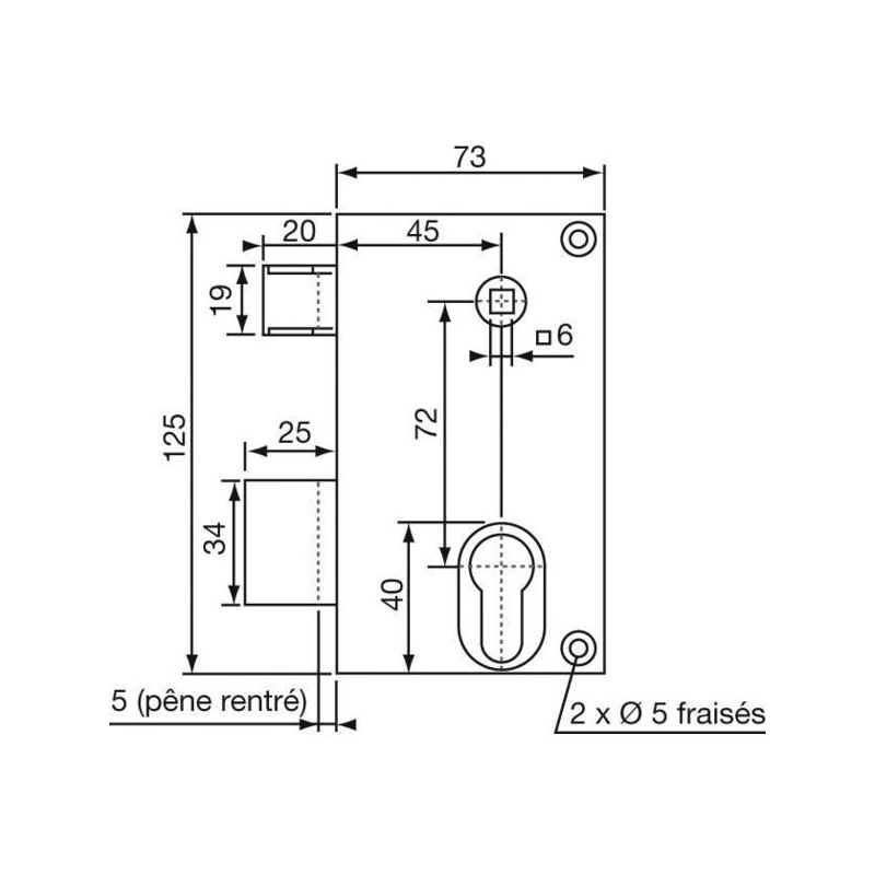 En acier verni pour barillet profilé. Traitement zingué bichromaté, pênes rallongés de 5 mm. Livré avec gâche, sans cylindre. Coffre horizontal : 141 x 87 mm Coffre vertical : 124 x 72,5 mm