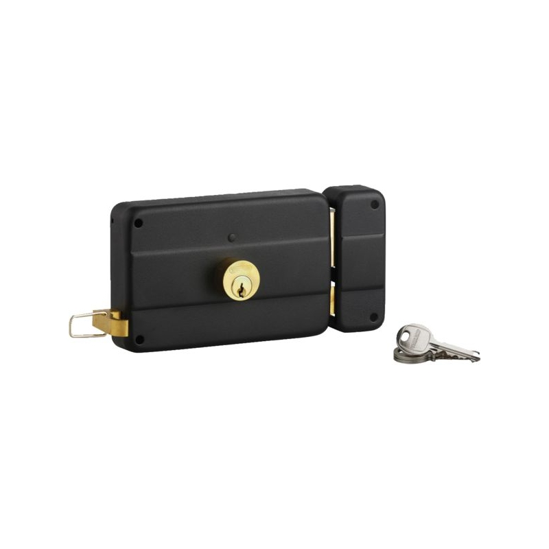 Acier embouti. Pêne et ½ tour en laiton. Mécanisme à 3 tours. Rappel du ½ tour par la clé. Double cylindre (diamètre 25 mm) laiton 5 goupilles. Entrée de cylindre et de fouillot en acier. Livré avec gâche et 3 clés laiton nickelé. Dimensions coffre : 140 x 90 mm Longueur : 45 mm Axe : 60 mm Entraxe : 120 mm Fouillot carré : 6 mm