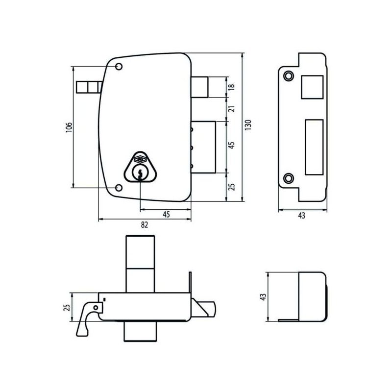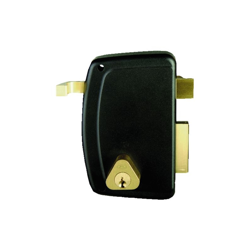 À cylindre laiton. Pêne ½ tour en laiton. Équerre au ½ tour pour manœuvre extérieure. Coffre et gâche acier embouti. Pênes laiton massif. Protection anticorrosion. Livré avec gâche et 3 clés. Course du pêne dormant : 21 mm Finition : époxy noir Modèles horizontaux : Dimensions : 143 x 99 x 25 mm Entraxe : 60 mm Code 50141 fouillot carré : 6 mm Modèles verticaux : Dimensions : 130 x 99 x 25 mm Entraxe : 70 mm Code 50142 fouillot carré : 7 mm
