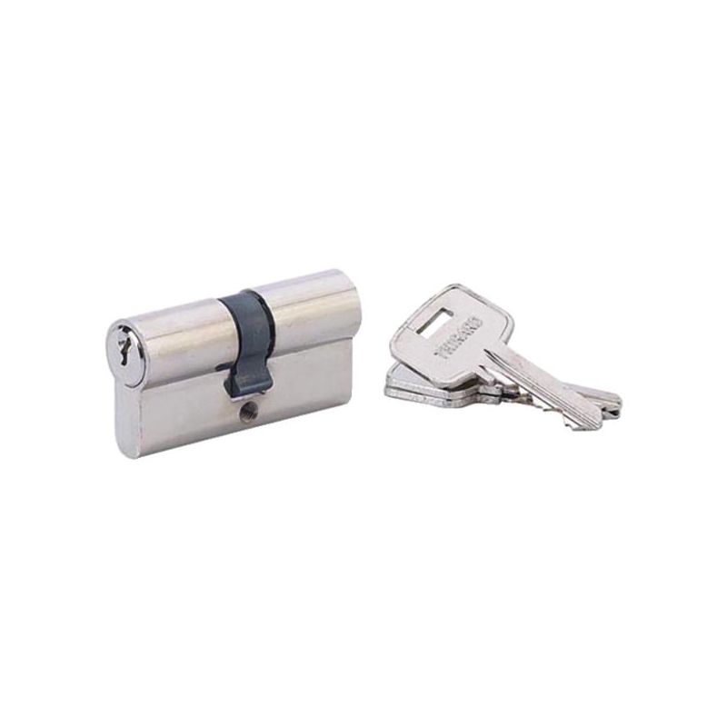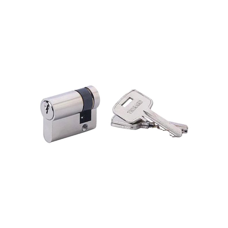 Cylindre laiton à profil européen. 5 goupilles. Panneton anti arrachement. Livré avec 3 clés. Conforme à la norme EN 1303-2015 Finition : laiton nickelé