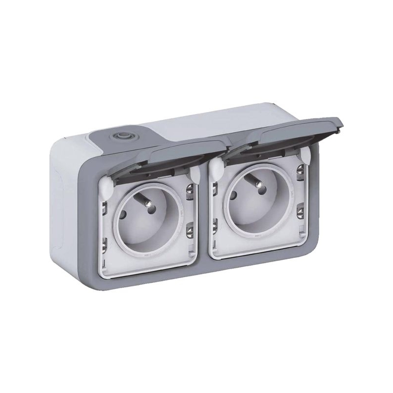 Convient pour extérieur et locaux humides. Prise équipée de bornes automatiques pour raccorder les fils sans outil. Perforable pour câble ou tube. Indice de protection : IP 55
