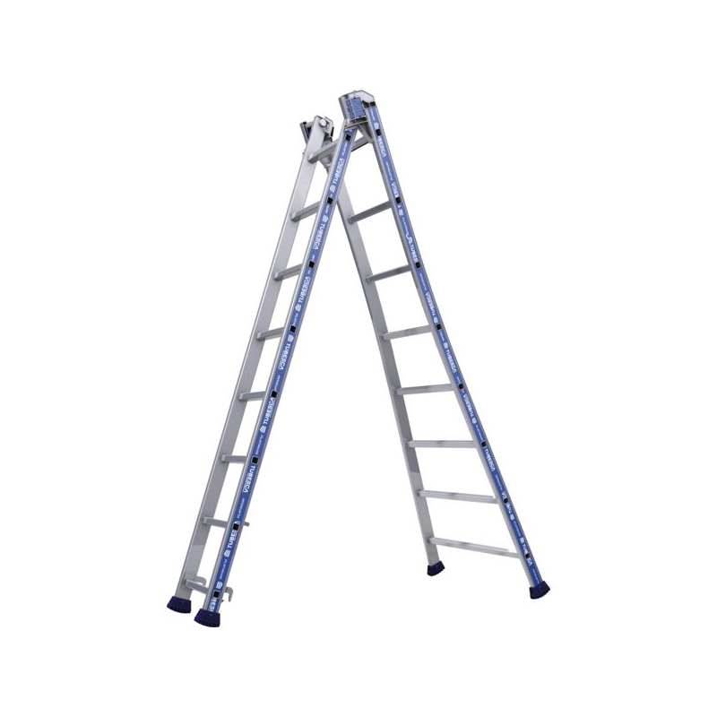 Utilisation sur sol plat ou dénivelé, usage ultra intensif. En aluminium. Échelons 30 x 30 mm. Articulation et montants renforcés. Glissière en aluminium avec patins de glissement intégrés. Base évasée pour une stabilité maximum. Sabots enveloppants avec témoin d'usure. Norme : NF - EN 131 - Décret 96 333