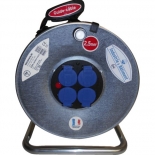 Équipé de 4 prises 2P+T - 16 A - 230 V à volet d'obturation. Tambour en tôle galvanisé. Disjoncteur thermique. Guide câble. Câble noir H07RNF 3G2,5 mm². Indice de protection : IP 44 Norme : NF EN 61242