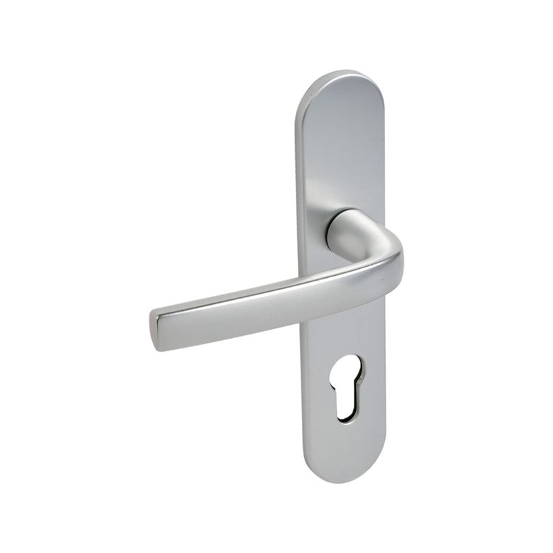 Monobloc en aluminium, béquille et plaque solidarisées. Pour porte intérieure d'épaisseur 40 mm. Plaque : 190 x 42 mm Entraxe de fixation : 165 mm Entraxe de serrure : 70 mm Fouillot carré : 7 mm Finition : argent