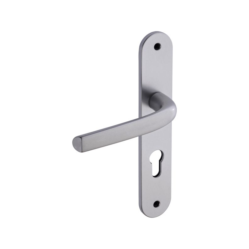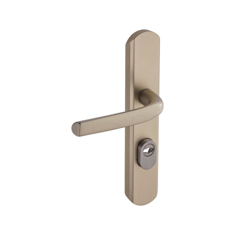Monobloc, béquille et plaque solidarisées. Pour porte d'épaisseur 40 mm. Protecteur de cylindre réglable en profondeur. Côté extérieur plaque en aluminium massif avec protecteur. Côté intérieur plaque en aluminium avec support en polyamide renforcé de fibre de verre (60%). Vis traversante M4. Plaque : 240 x 50 mm Entraxe de fixation : 195 mm Entraxe serrure : 70 mm Fouillot carré : 7 mm