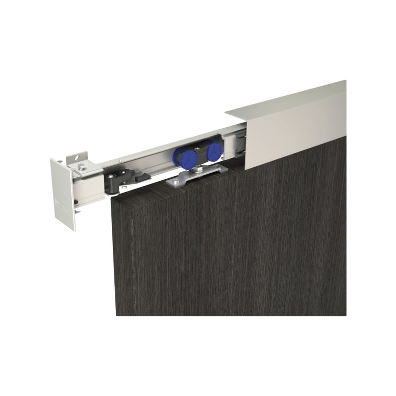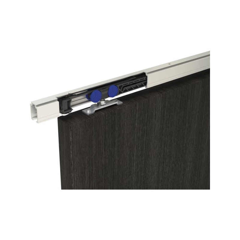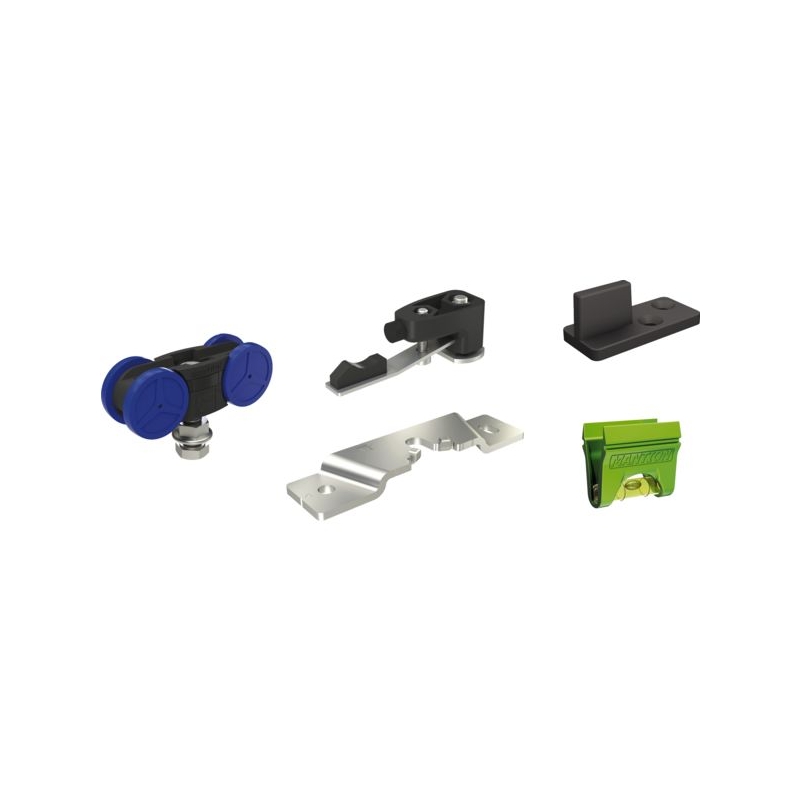 Garniture pour 1 porte de 81 à 120 Kg maxi comprenant : - 2 montures 13232 (montées sur roulements à billes), - 2 platines 13036, - 2 butées d’arrêt réglables 11213, - 1 guide au sol 1103R, - 1 Buly (niveau à bulle).