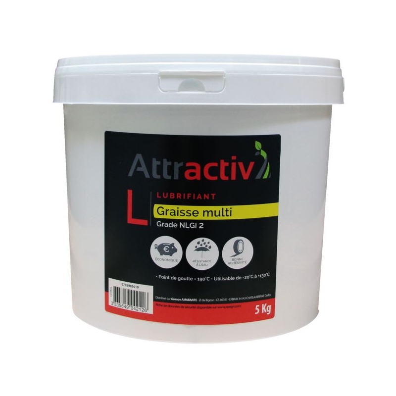 Bonne adhérence. Grade : NLGI 2 Point de goutte : >180°C Plage de température d'utilisation : -20°C à +110°C Conditionnement : seau de 5 kg Vendu en lot de 4 seaux.