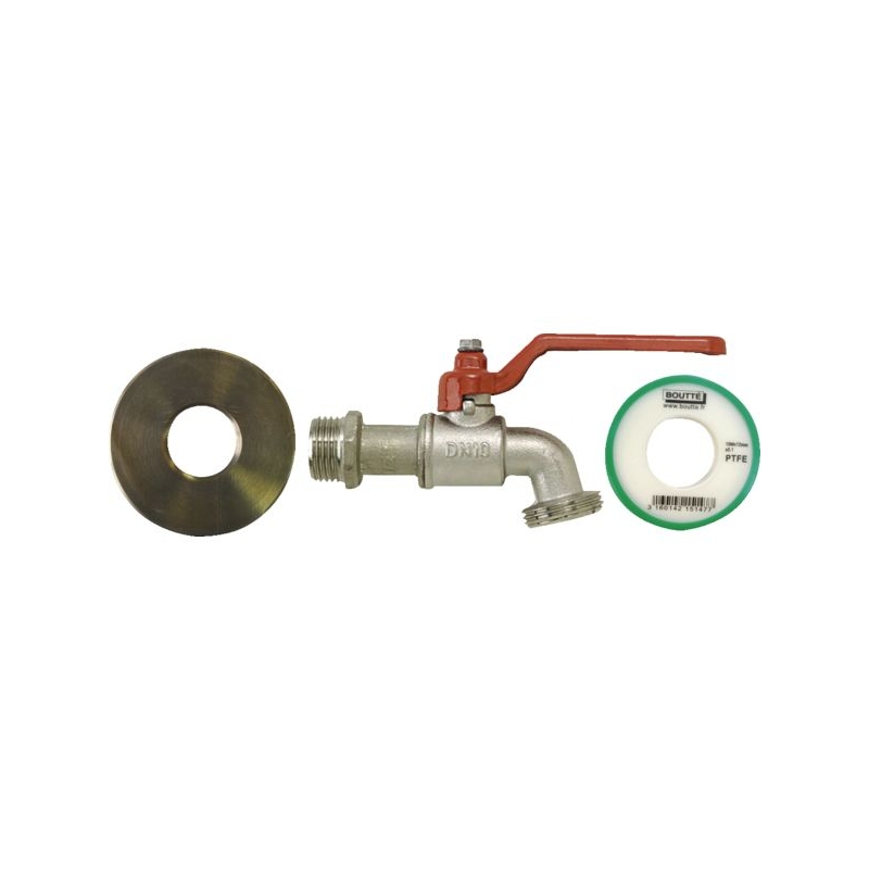 Permet d’adapter un robinet standard sur une sortie de cuve grillagée 1000 L Ø 60 mm. Il suffit de visser l’adaptateur en laiton puis venir visser le robinet 1/4 tour sur la sortie femelle 20 x 27 mm de l’adaptateur. Composé de : - 1 robinet ¼ tour, - 1 adaptateur, - 1 rouleau ruban téflon, - 1 joint. Nez de robinet mâle : 20 x 27 mm