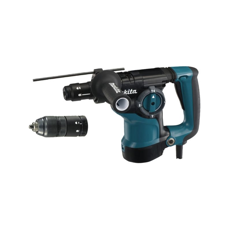 Emmanchement SDS-Plus. Poignée arrière soft-grip et antivibration. Stop de rotation, stop de frappe, débrayage de sécurité. Mandrin interchangeable et éclairage LED. Puissance : 800 W Puissance de frappe : 2,9 J Vitesse : 1100 tr/mn Cadence de frappe : 4500 cps/mn Capacité de perçage : béton : 28 mm couronne trépan : 80 mm Taux de vibrations : 15 m/s² Poids : 3,600 kg Livré en coffret avec mandrin interchangeable autoserrant, mandrin SDS-Plus, jauge de profondeur.