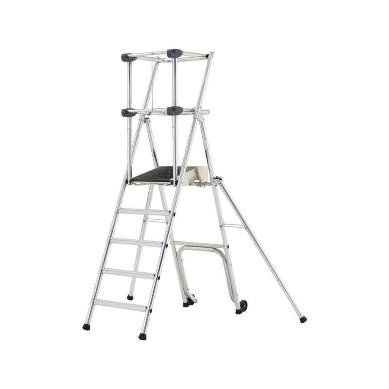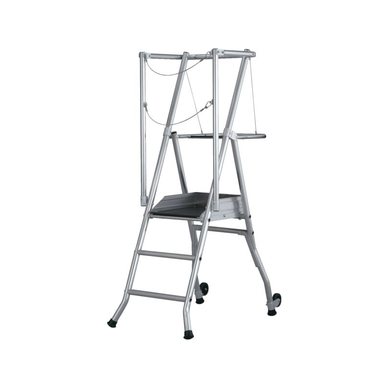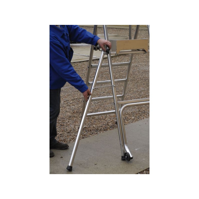 Utilisation sol plat. Plate-forme aluminium sécurisée. Garde-corps fixe antichute à portillon. Plate-forme 400 x 490 mm avec plinthes intégrées. Marches largeur 60 mm. 2 roulettes pour faciliter les déplacements. Modèles 4 et 5 marches avec stabilisateurs. Charge maxi. : 150 kg Norme : PIRL NFP 93353 - Décret 2004.924 - EN 131-7