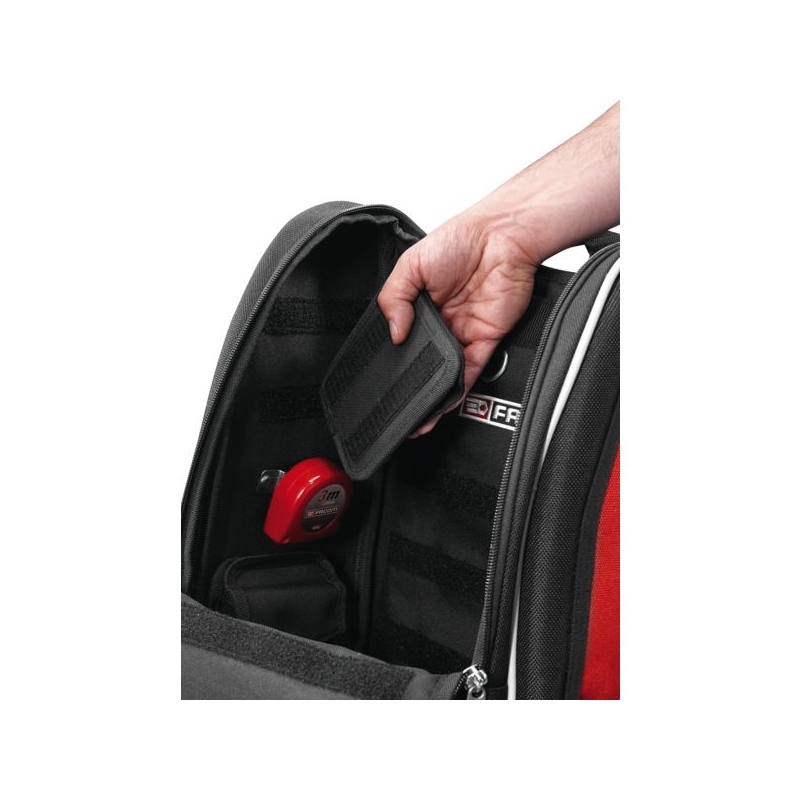 Permet de passer dans des espaces confinés. Compatible avec les échelles à crinoline. Fermetures à glissières cadenassables. Pochettes de rangement amovibles à positionnement libre grâce aux bandes de fixation (Velcro), avec élastique pour les outils. œillets extérieurs ovales pouvant porter jusqu'à 0,5 kg chacun. Bretelles matelassées, ergonomiques, poignée sur le dessus. Bandes réfléchissantes sur le devant et les côtés. Charge maxi : 10 kg Dimensions : 300 x 180 x 480 mm Livré sans outils.