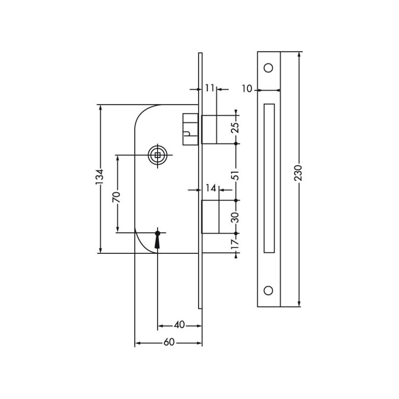 Réversible sans démontage. Têtière largeur 20 mm, bouts ronds. Pêne ½ tour et fouillot en bronze d'alu. Livrée sans gâche. Disponible uniquement main droite. Norme NF P26-409. Axe : 40 mm Entraxe : 70 mm Fouillot carré : 7 mm