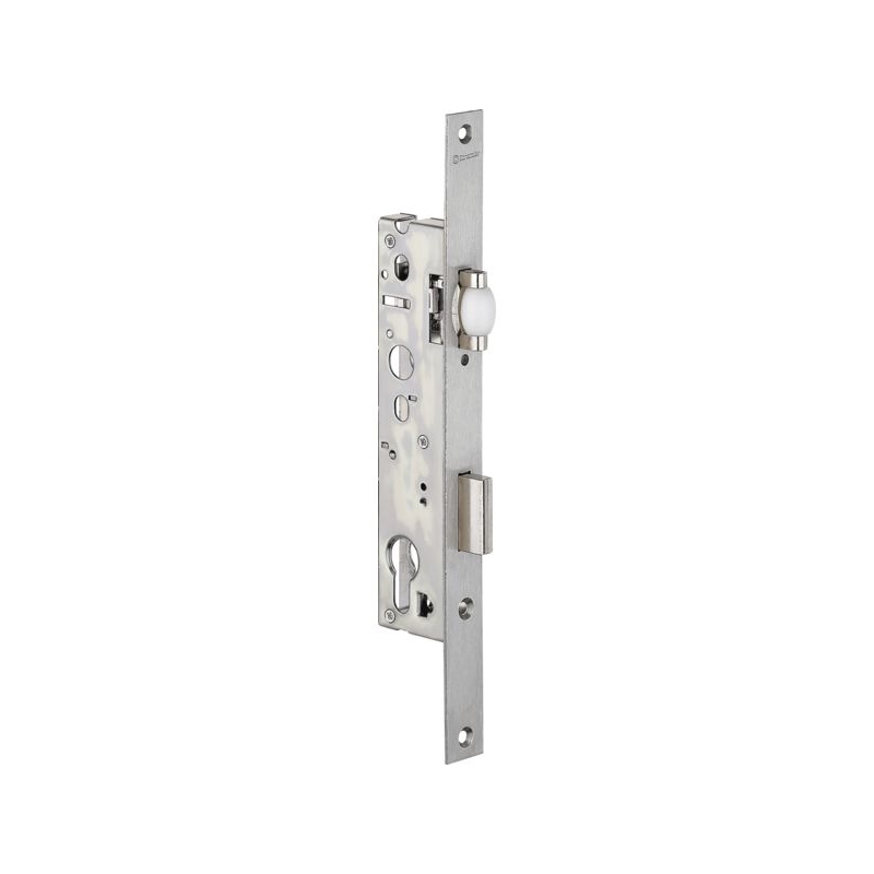 Le pêne ½ tour est équipé d'un patin de glissement intégré adoucissant le bruit de la fermeture et protégeant le profil des rayures. Coffre en acier zingué. Rappel du ½ tour par la clé. Têtière plate en inox 304 L. Gâche à commander séparément. Dimensions coffre : 194 x 16.5 mm Rouleau en nylon réglable : 7 à 19 mm Saillie du pêne dormant : 15 mm Entraxe : 92 mm Fouillot carré : 8 mm Têtière plate : 244 x 22 mm Entraxe de perçage : 220 mm