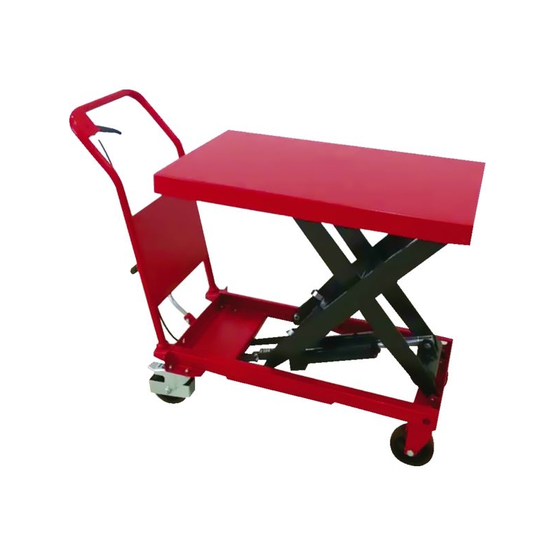 Commande de levage à pédale par vérin hydraulique. Commande de descente manuelle par levier. Roues à bandage caoutchouc 2 fixes et 2 pivotantes à frein. Capacité de charge : 500 kg Dimensions plateau : 850 x 500 mm Hauteur mini/maxi : 340/900 mm Poids : 87 kg