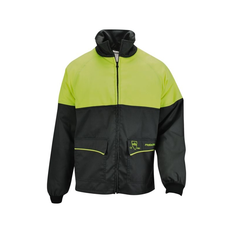 Déperlant avec finition fluocarbone. Tissu double face 70% polyester face extérieure pour une importante résistance mécanique et 30% coton sur la face intérieure du tissu pour le confort, 240 g/m². Complexe de protection scie à chaîne 8 couches et 16 couches (épaules et avant bras). Ventilation dorsale par superposition des panneaux de tissu. 2 poches fermées par rabat. Fermeture à glissière simple curseur séparable. Poignet bord cote. Poids : 1,600 kg pour la taille M Coloris : noir/jaune (NOJA), rouge/jaune (REJA) Taille : M à 2XL Norme : CE Cat III - EN 381-11 (1) Pour commander, faire suivre le code du coloris et de la taille (ex : 18632-NOJA-M).